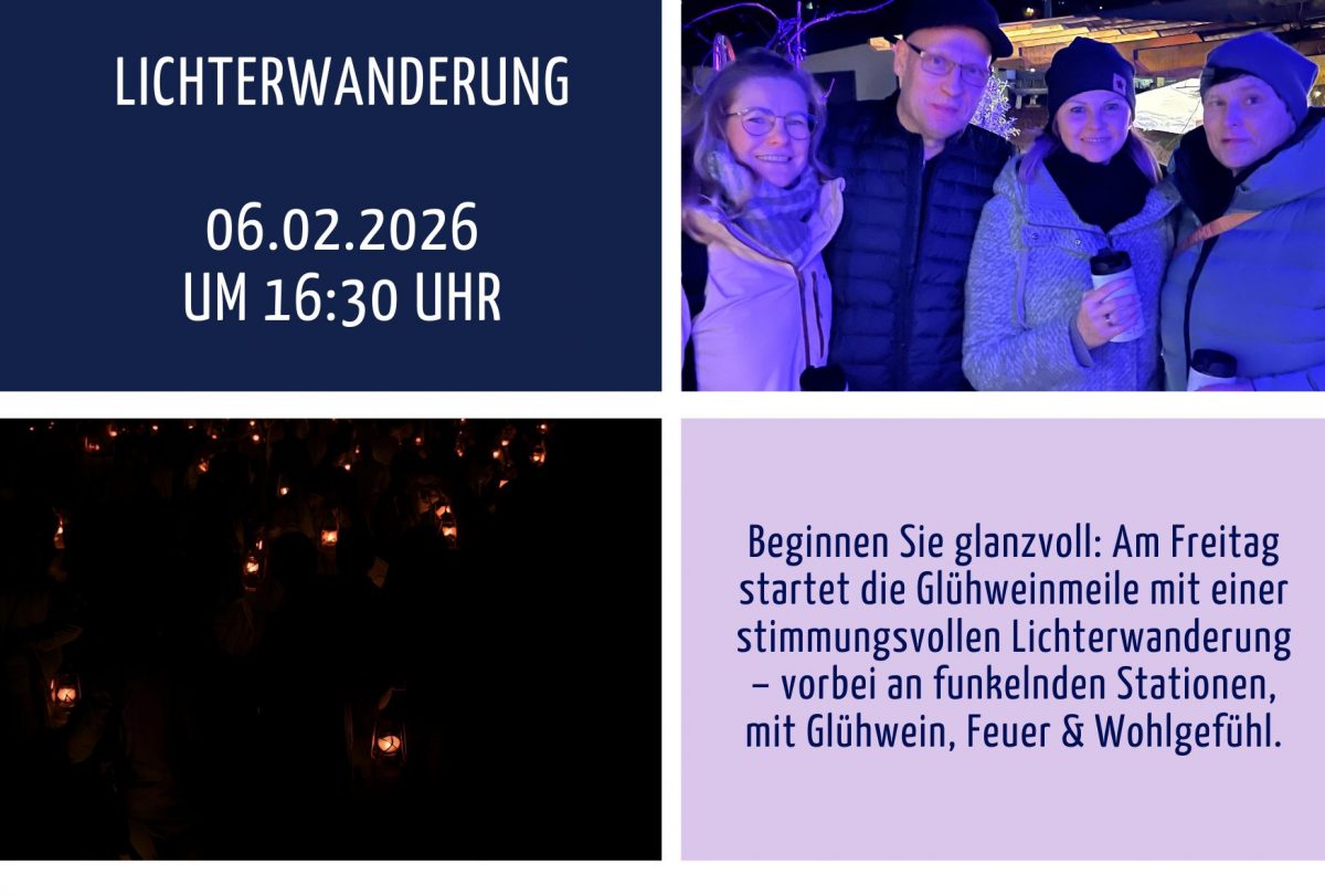 Starten Sie den Freitagabend mit Lichterwanderung und starten damit die Glühweinmeile! Auf Ihrer Route kehren Sie bei 4 Weinhäusern ein und genießen in jedem Haus ein Glas (0,2l) herrlich duftenden Glühwein. Auch für das leibliche Wohl ist unterwegs bestens gesorgt. Der krönende Abschluss erwartet Sie am Landgasthof „Zum Ross“ – am prasselnden Feuer servieren wir Ihnen eine deftige Suppe zum Sattessen.